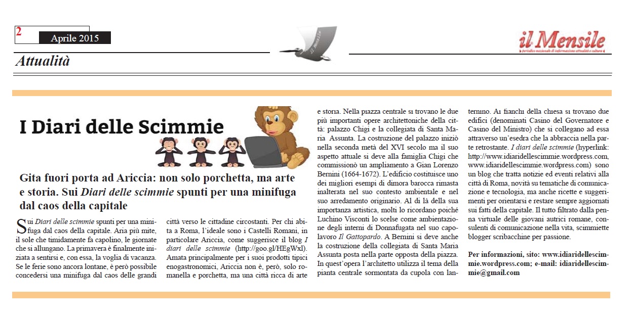 I Diari delle Scimmie su Il Mensile di aprile 2015