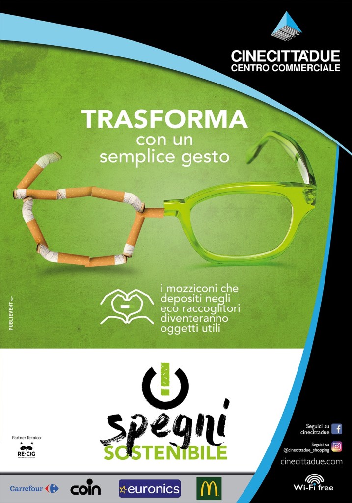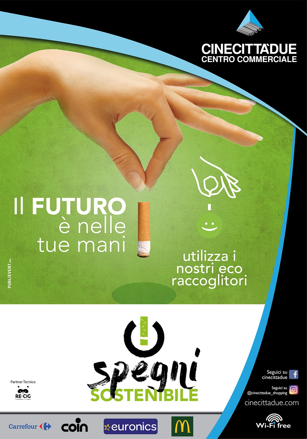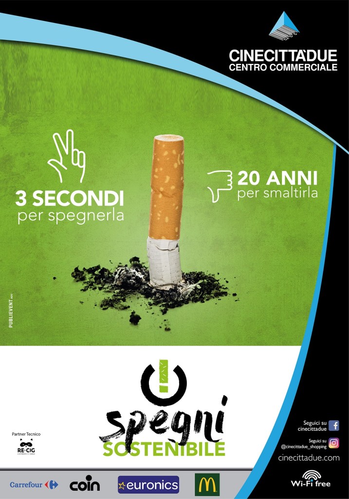 Il Centro Commerciale CinecittàDue presenta “Spegni Sostenibile”, la prima campagna di raccolta differenziata e riciclo dei mozziconi di sigaretta concepita, con metodologie industriali, per essere realizzata in simultanea in centri commerciali e retail park in tutta Italia. I mozziconi, quotidianamente raccolti, saranno stoccati in appositi fusti sigillati e trasferiti a un innovativo impianto di trasformazione per essere purificati e trasformati in un polimero plastico, utilizzabile in diversi settori nella produzione di oggetti di uso comune.