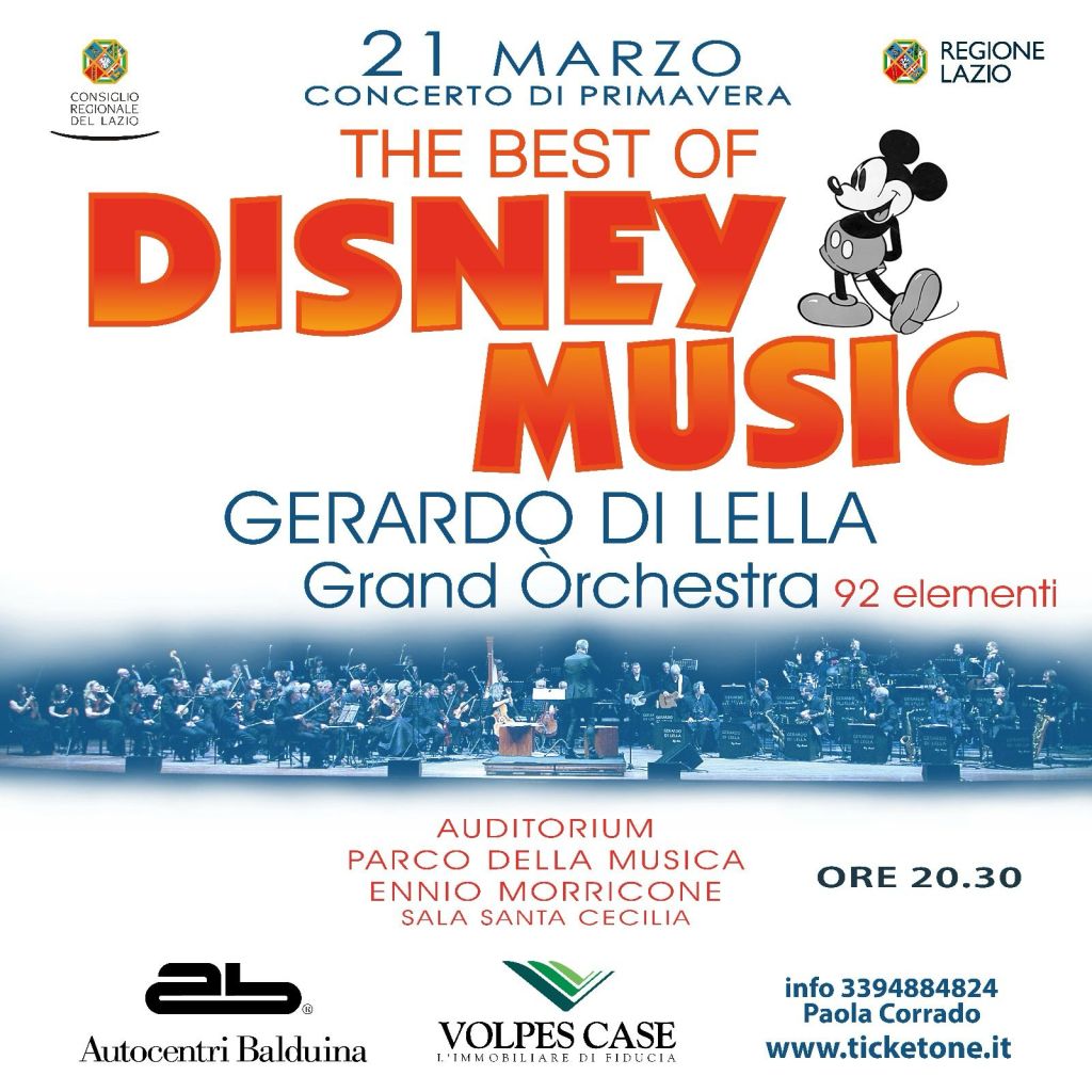 Il grande concerto-evento “The best of Disney Music”, diretto dal Maestro Gerardo Di Lella ed eseguito dalla sua “Grand Orchestra”, andrà in scena giovedì 21 marzo alle ore 20.30 presso l’Auditorium Parco della Musica Ennio Morricone di Roma. L’orchestra, costruita ad hoc per l’occasione, vede la compresenza di una orchestra sinfonica, di una orchestra pop e di una big band, per un totale di 92 musicisti sul palco, e comprende coro e voci solistiche. La conduzione della serata è affidata alla giornalista Sonia Sarno.