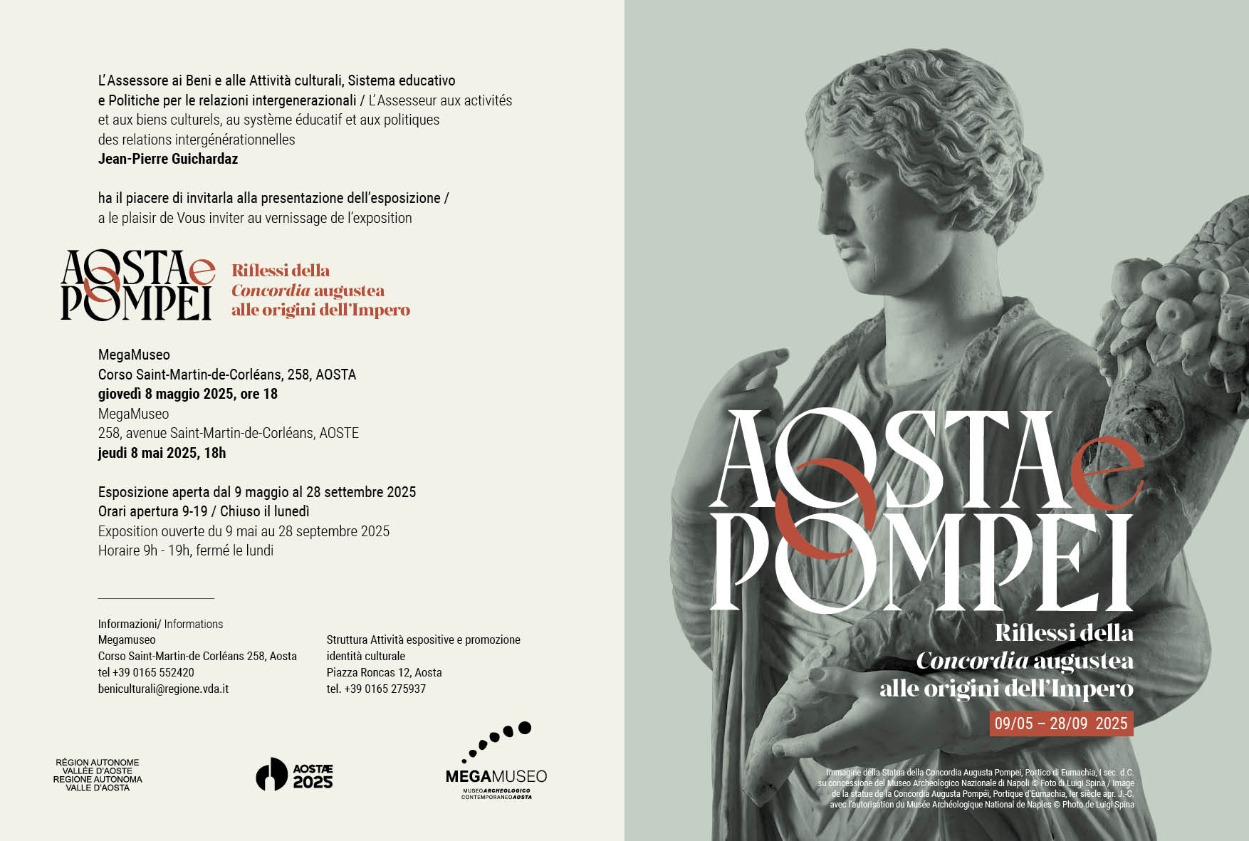 Curata da Patrizia Fortini e Cristiano Benedetto De Vita, la mostra mette in dialogo due città lontane ma unite dalla visione politica di Augusto: trasformare la varietà dei territori dell’Impero in una civiltà condivisa. Aosta, città di fondazione strategica, rappresenta un modello urbanistico e amministrativo; Pompei, con il suo straordinario patrimonio, riflette l’adesione culturale all’ideale augusteo, incarnato dalla statua della dea Concordia Augusta, simbolo di armonia sociale e coesione tra popoli. Attraverso reperti, opere d’arte e oggetti della vita quotidiana, l’esposizione racconta come il progetto di unificazione di Augusto abbia saputo intrecciare politica, cultura e spiritualità, lasciando un’eredità capace di attraversare i secoli.